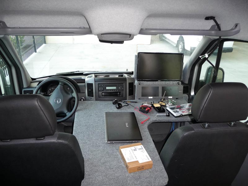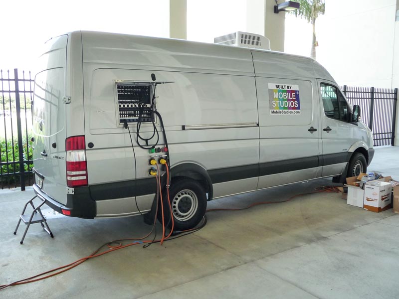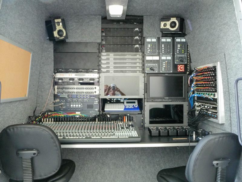 Mobile Studios worked closely with ESPN during 2010 to develop the first small-format production vehicle designed specifically for ESPN3 broadcasting... a Mercedes Sprinter built and delivered to Mobile Content Producers (MCP). MCP was subsequently acquired by ROSS Video Productions and the Mercedes Sprinter was featured on the floor of NAB 2011. Configured for a nine man crew; Producer, Director, Technical Director, 2 Replay Operators, 1 Graphics Operator, 1 Audio Engineer, 1 Camera Shader….it provided ample space and desk area for all crew functions.
