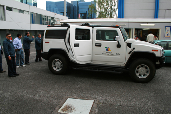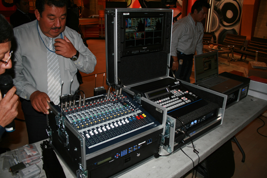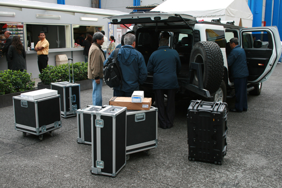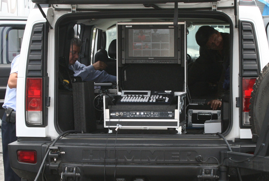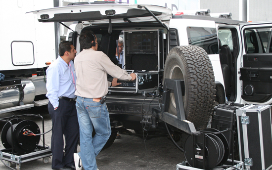 Given this daunting task by TV Azteca, it was up to Mobile Studios to create a solution. Out of this need the PortaCast® modular system was born. The solution included a new design for several mini- flypacks for switching/communications, engineering/sound and recording. The system could be transported by only one person if necessary, easily loaded onto smaller vehicles and travel with crew as checked baggage. With this modular PortaCast system, TV Azteca now has a truly rapid-response production team that can go anywhere on a moments notice. In the pictures above, the back of an SUV (Hummer H2) can be converted into a full production studio quickly and easily. It took a three man crew less than fifteen minutes to unload all the gear, open and connect the three PortaCast units, set up the cameras and other equipment, and go “on air” during the field test.